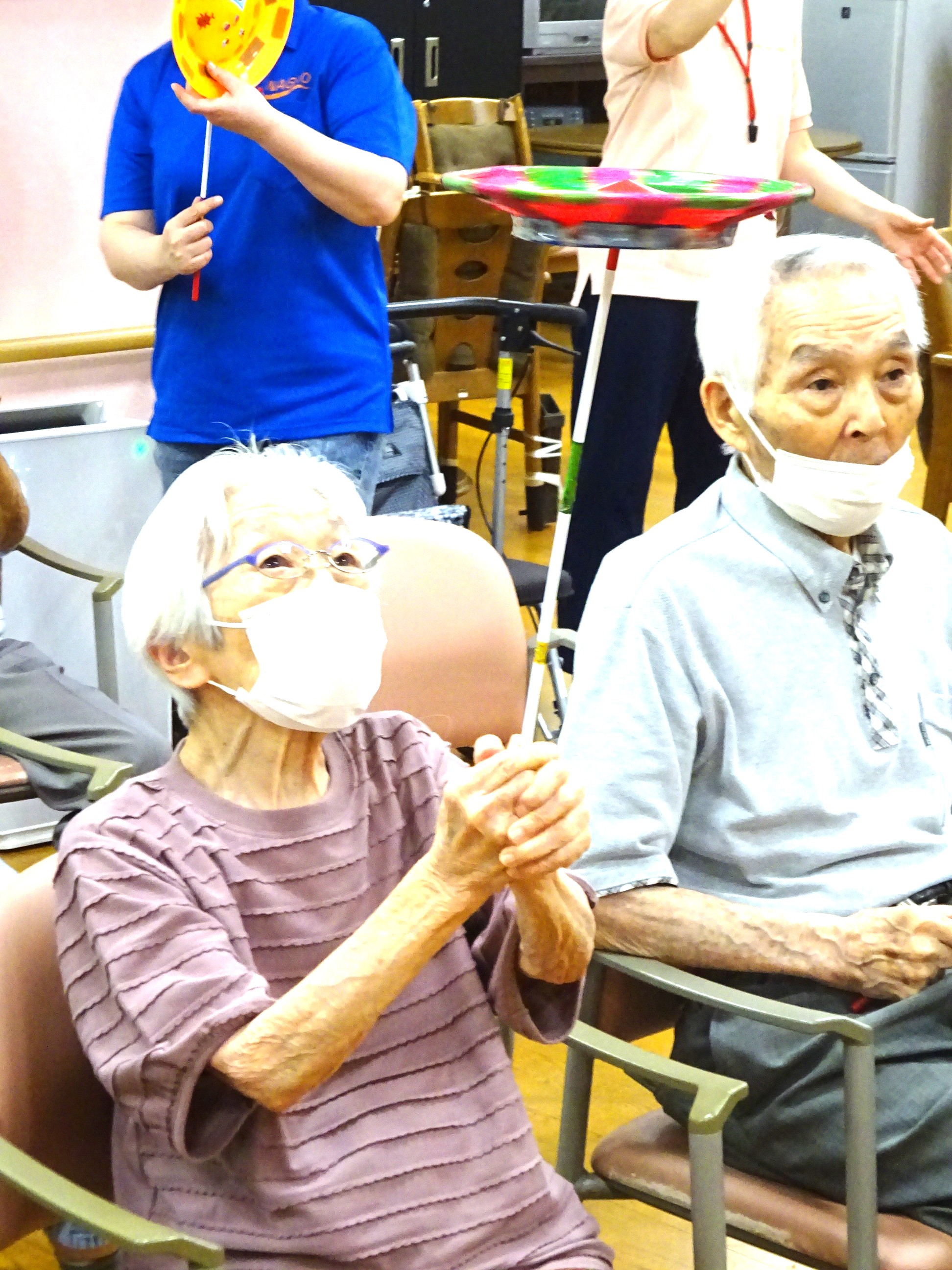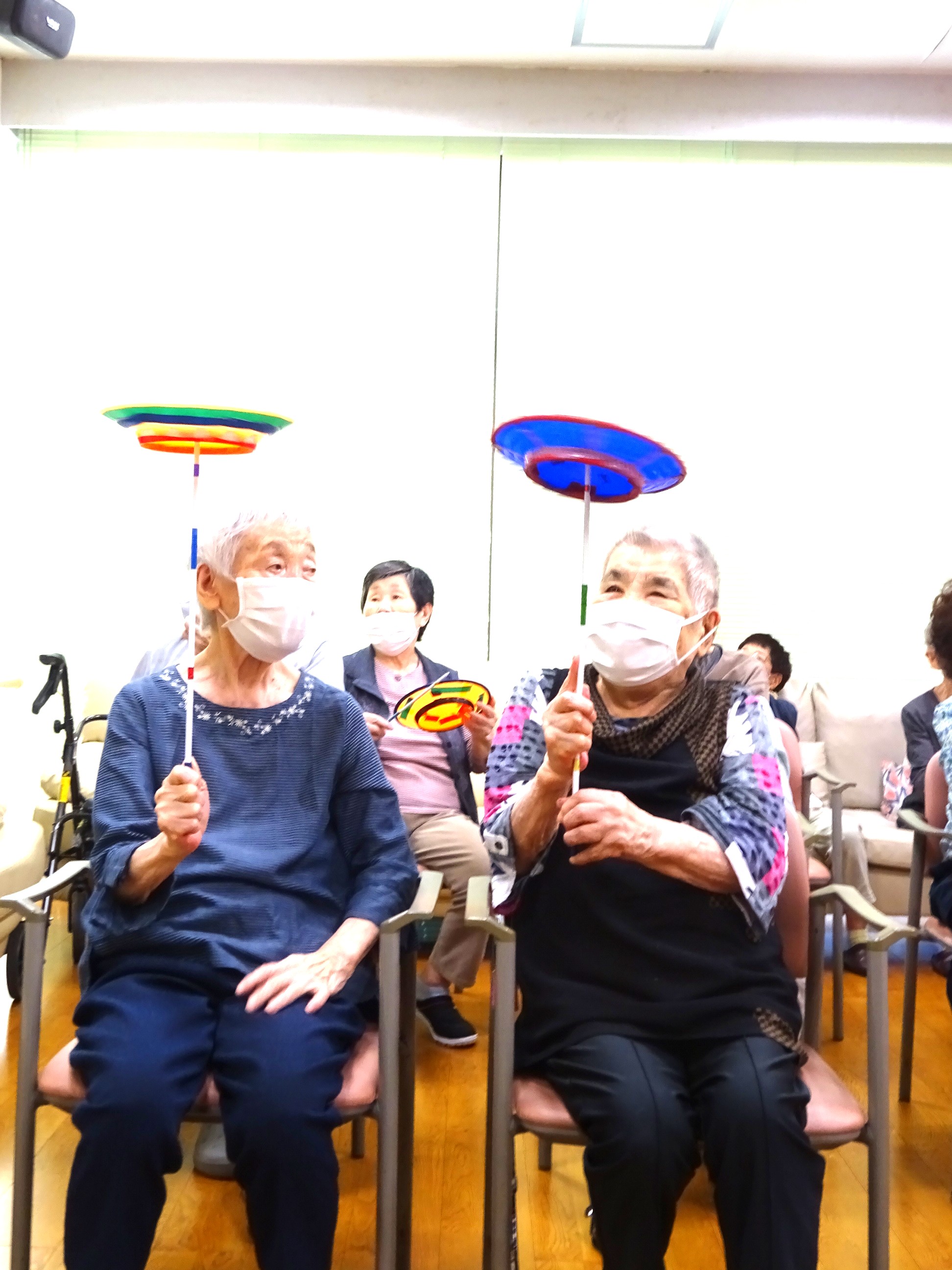 回っているのを棒に乗せてもらい、皿回し体験を楽しみました♪